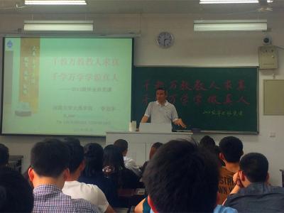 接下来针对毕业班同学的具体情况,李书记为我们上了大学期间“最后一堂党课”。在这堂党课中,李书记提到了三位名人:第一个是台湾大学教授的经历,教育我们不要仅仅关注自己的成绩,要抱有一些情怀,做一下对社会有用的事情:第二位是文革罪人康生,此人虽有才但是人品极差,最后的结局也是及其惨烈,以此告诫我们有才华固然重要,但是对于人生幸福来说,人品的好坏更为关键;第三位是陈道明,书记用他的故事告诉我们人不光只做有用的事情,有些时候无用之事更加能够帮助我们建立起自己的内心世界,不被外界的纷扰动摇。在举了三个名人的事情后,书记还用他自己的故事告诉我们培养一个好的兴趣爱好是多么重要的一件事,虽然无用,但可安心。